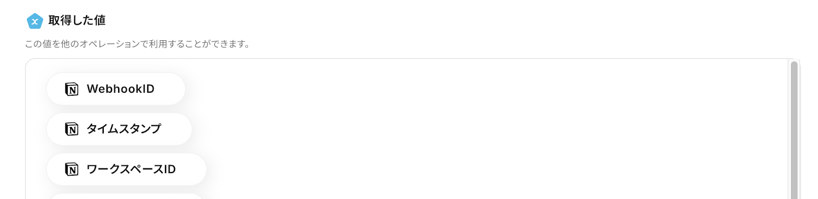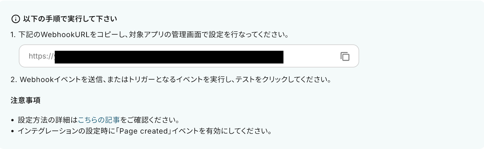 画面の説明内容に基づいて設定作業を行います。 ※詳しい設定方法はこちら をご確認ください。 ※WebhookアクションはNotionの有料プランでのみ利用可能です。