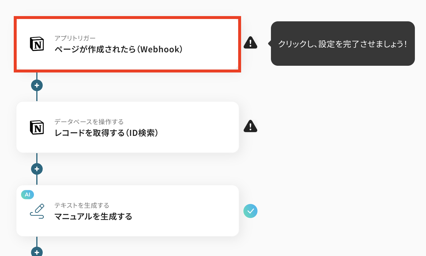 それではここから代表的な例として「Notionに業務データが追加された際に、その情報をもとにAIがマニュアル案を自動で作成し、Google スプレッドシートに内容を追加する 」フローを解説していきます!