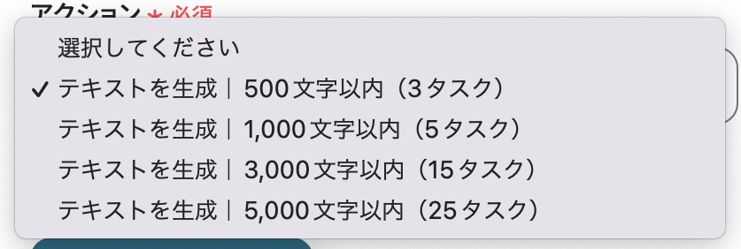 「タイトル」は必要に応じて変更してください。 「アクション」はこの後に設定するプロンプトの文字数に応じて設定します。 文字数に応じて、消費するタスク数が異なるので注意してください。 ※プランごとのタスク数は料金プラン からご確認いただけます!