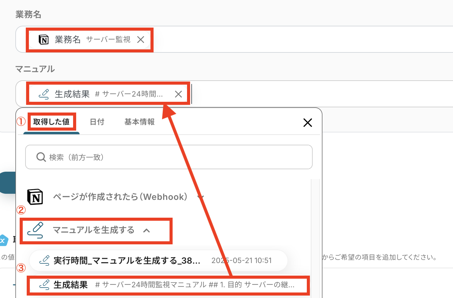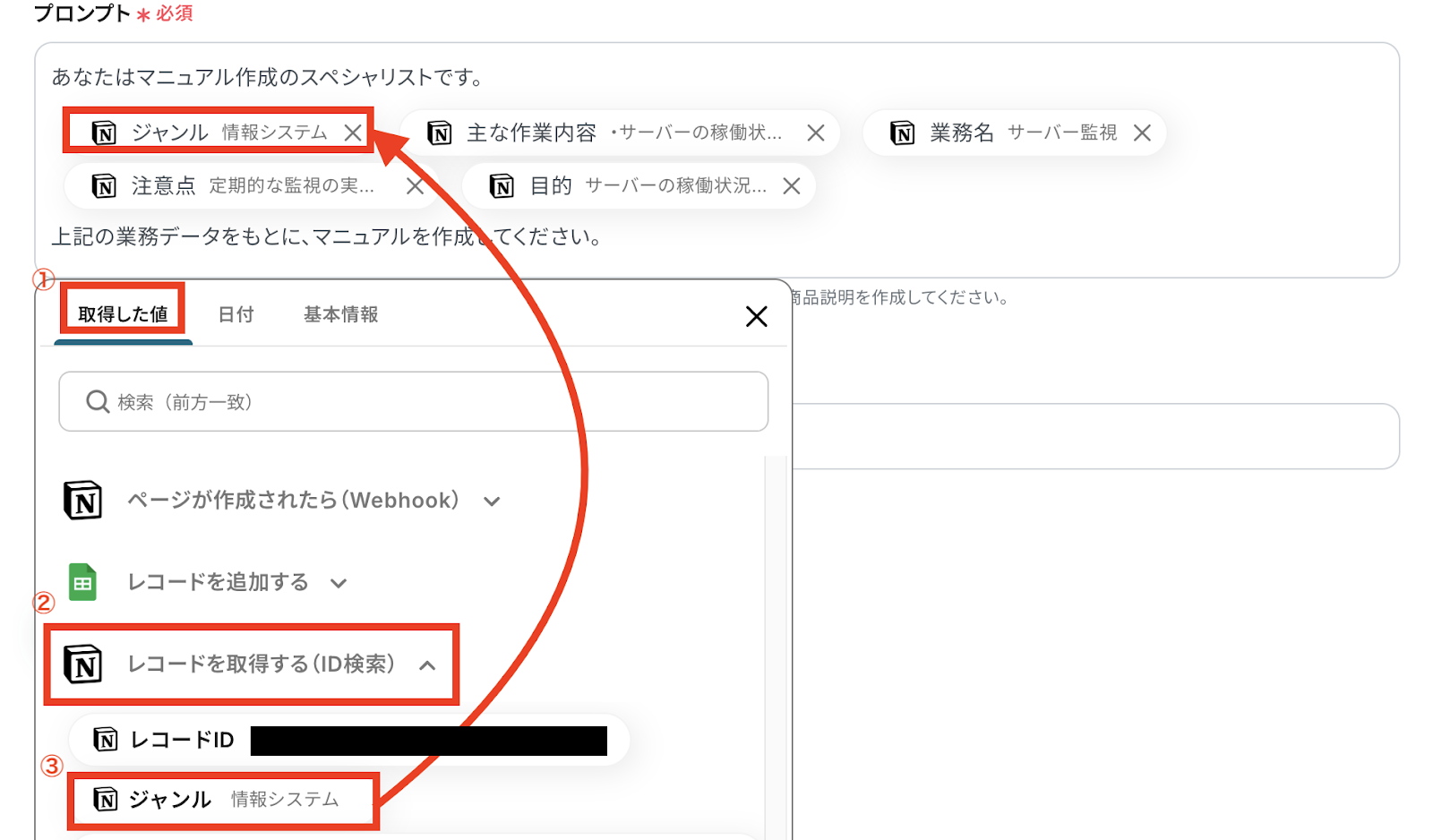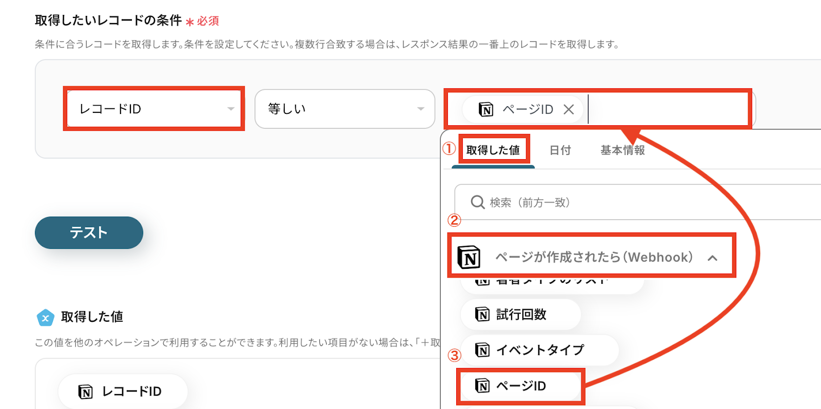 「取得したいレコードの条件」をステップ3で取得した値を活用して入力していきます。 【取得した値の活用方法】 ①入力欄をクリックして「取得した値」を表示 ②「ページが作成されたら(Webhook)」をクリック ③「ページID」を選択