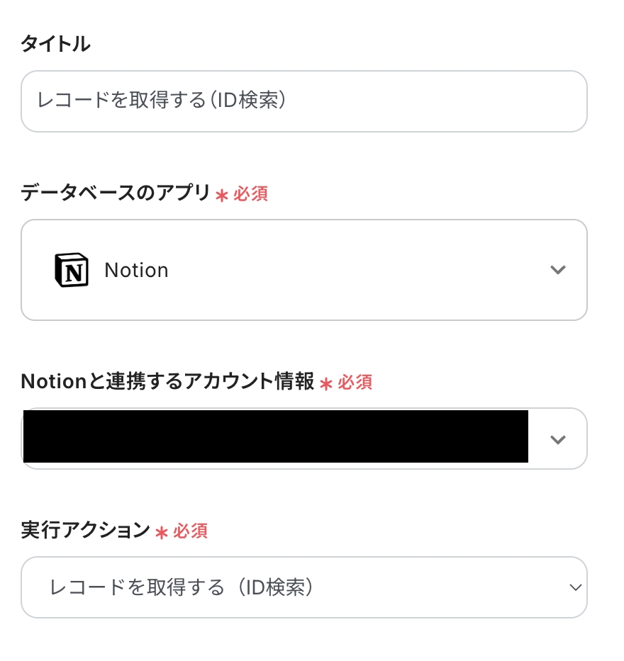 必要箇所を入力していきます。 「タイトル」:必要に応じて変更可能 「Notionと連携するアカウント情報」:合っているか確認 「実行アクション」:「レコードを取得する(ID検索)」を選択