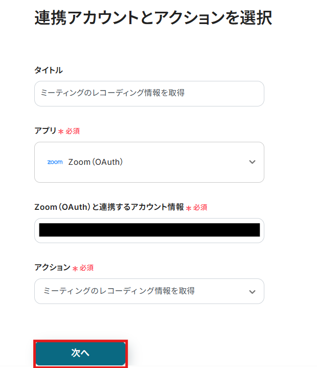 2) アクションは「ミーティングのレコーディング情報を取得」が選択されていることを確認し、「次へ」をクリックします。