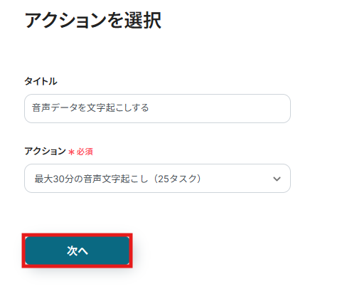 ※ここでは「最大30分の音声文字起こし(25タスク)」が選択されていますが、アクションは変更も可能です。