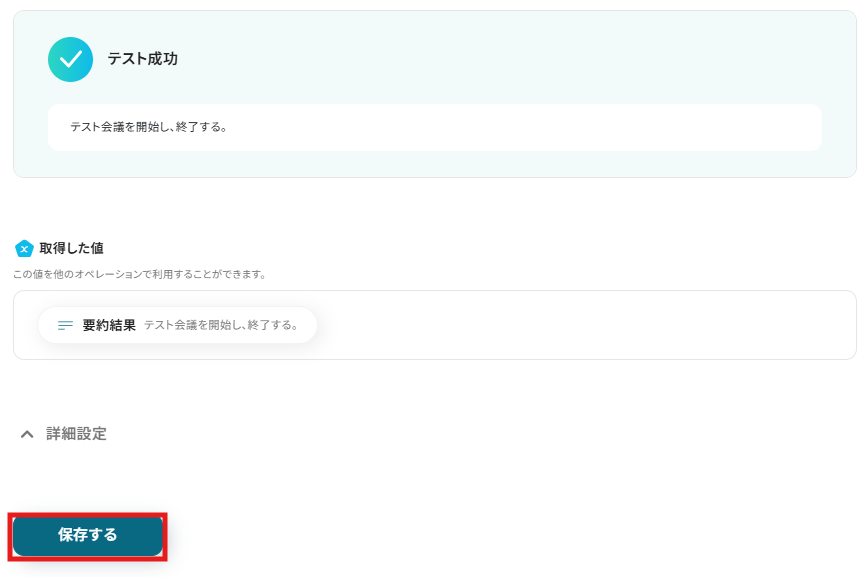 完了したら「テスト」をクリックし、テスト成功後「保存」をクリックします。