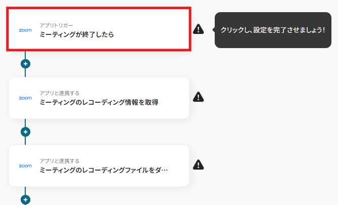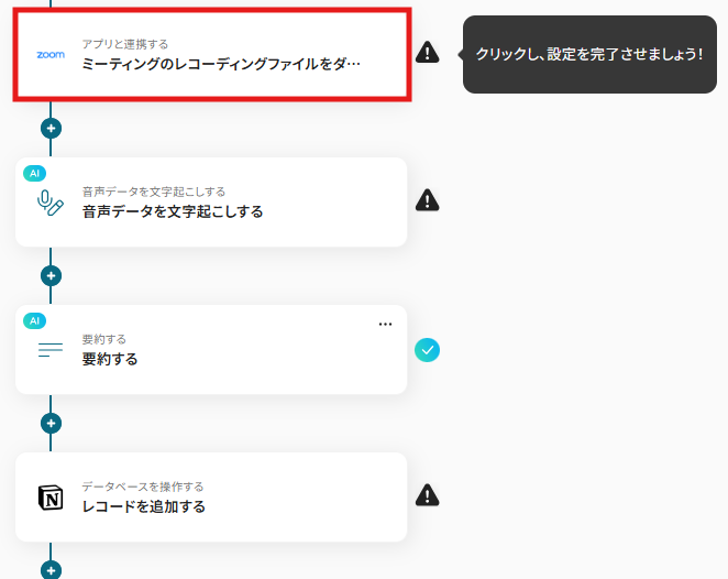 それではここから代表的な例として、Zoomミーティングが終了したら、AIが議事録を自動で作成し、その内容をNotionのデータベースに自動で追加するフローを解説していきます!