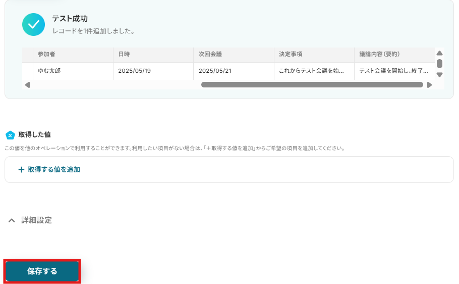 入力が完了したら、「テスト」をクリックし、テスト完了後、「保存」します。