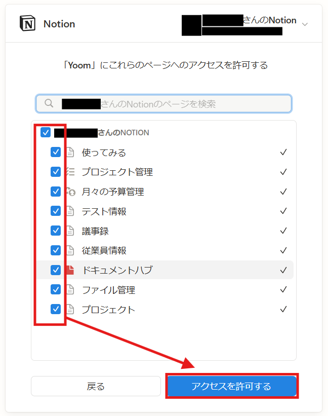 使用したいページを選択し、「アクセスを許可する」をクリックします。
