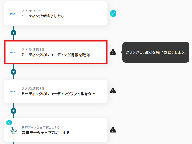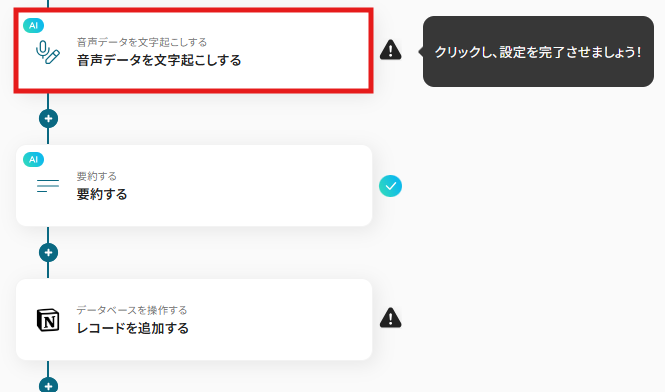 1) フローに戻り、「音声データを文字起こしする」のアイコンをクリックします。