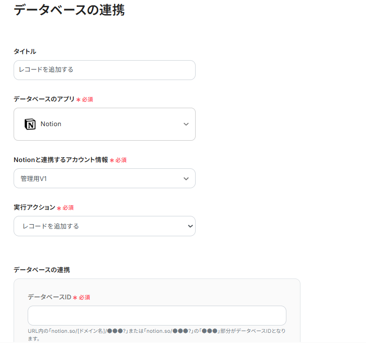 2) アクションは「レコードを追加する」が選択されていることを確認し、「データベースID」を入力します。