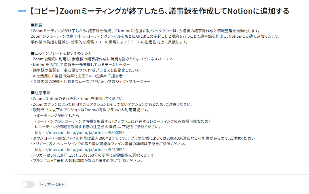Yoomにはミーティング後の議事録作成からNotionへの記録までを自動化できるテンプレートが用意されています。