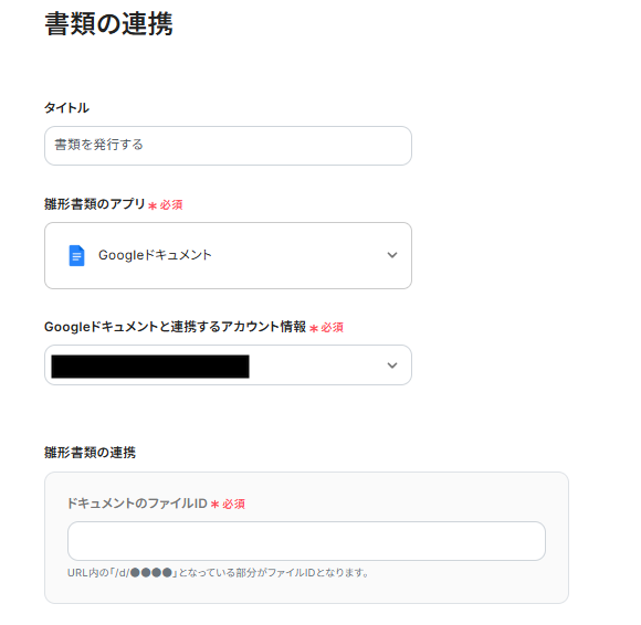2) アクションは「書類を発行する」が選択されていることを確認し、「ドキュメントのファイルID」を入力します。