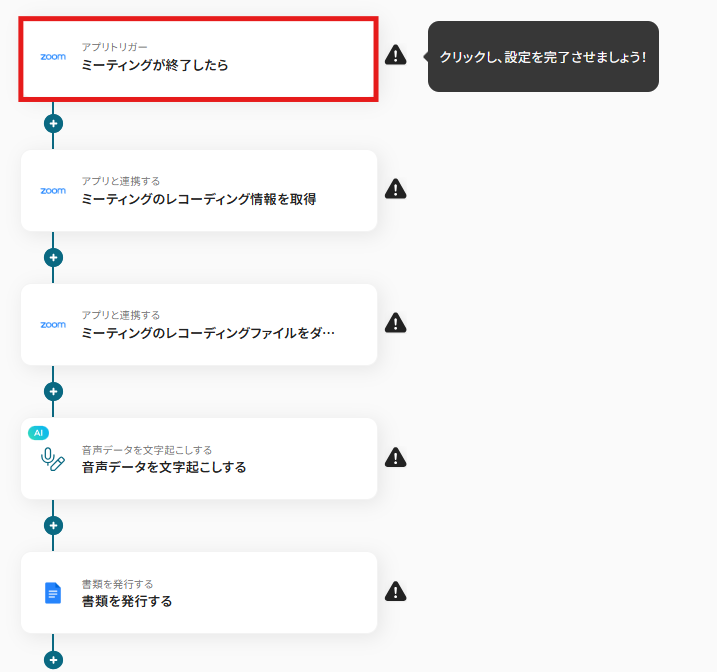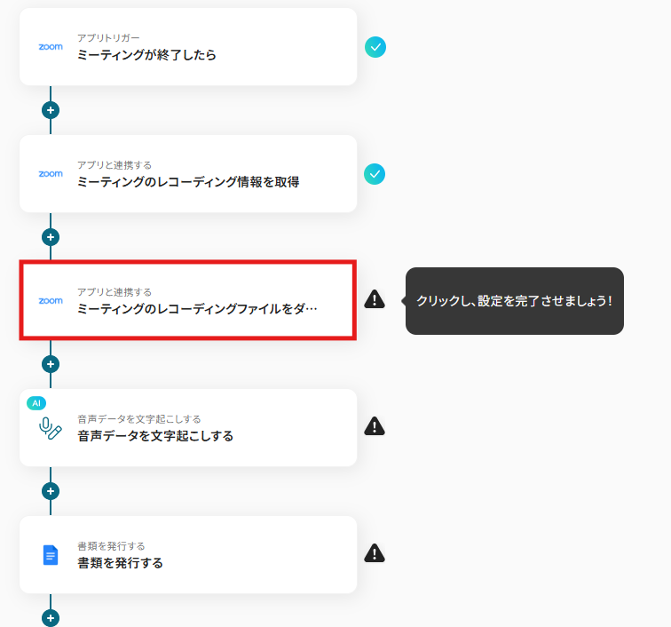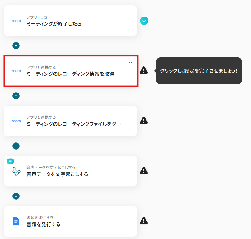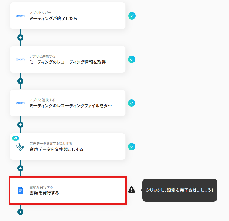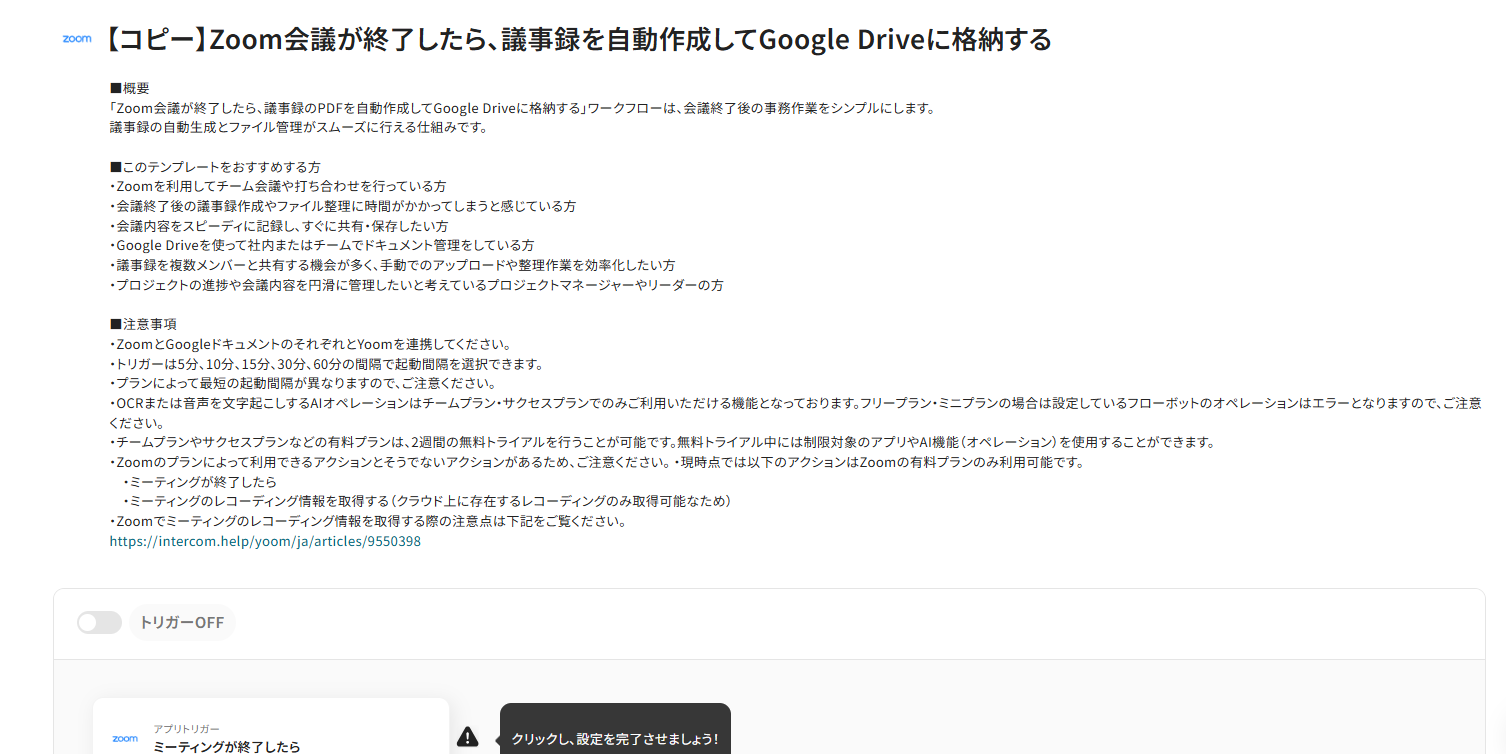 これで【Zoom会議が終了したら、議事録を自動作成してGoogle Driveに格納する】というフローが完成です。