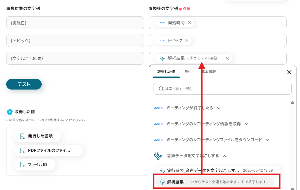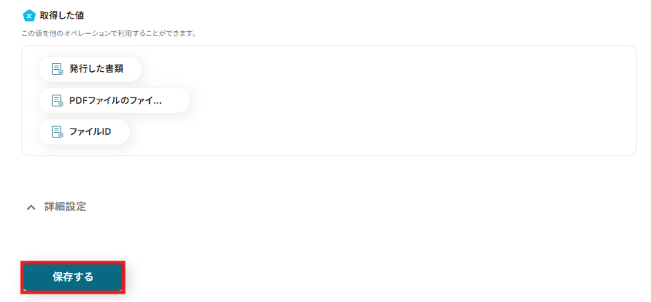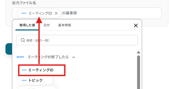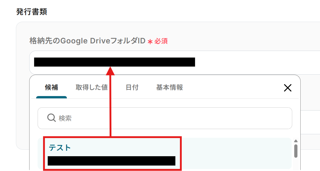 ドキュメントのファイルIDはボックスをクリックすると連携済みのIDが表示されるので、使用したいIDを選択してください。