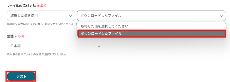 ファイルの添付方法は「取得した値を使用」「ダウンロードしたファイル」を選択します。