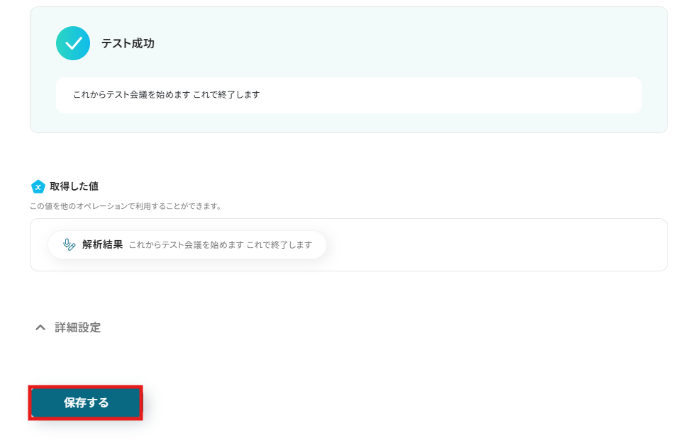 完了したら「テスト」をクリックし、テスト成功後「保存」をクリックします。
