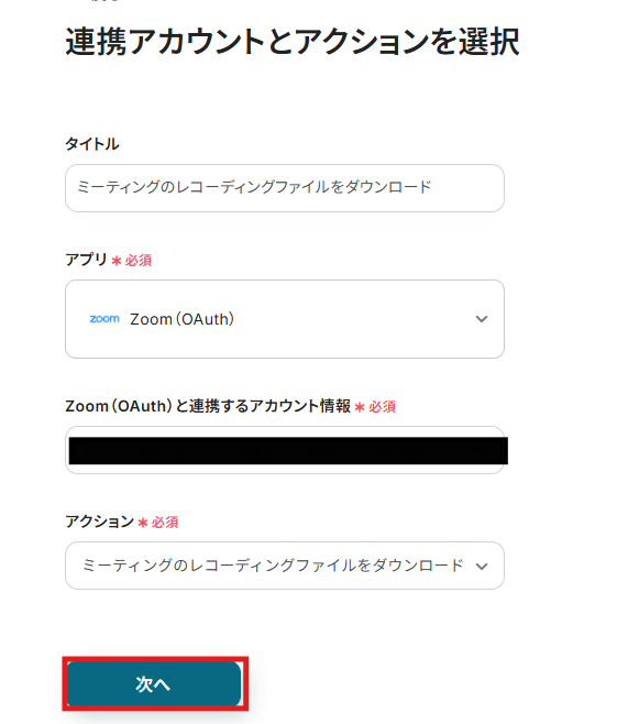 2) アクションは「ミーティングのレコーディングファイルをダウンロード」を選択して、「次へ」をクリックします。