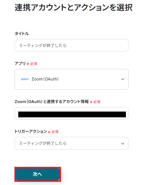 2) アクションは「ミーティングが終了したら」が選択されていることを確認し、「次へ」をクリックします。