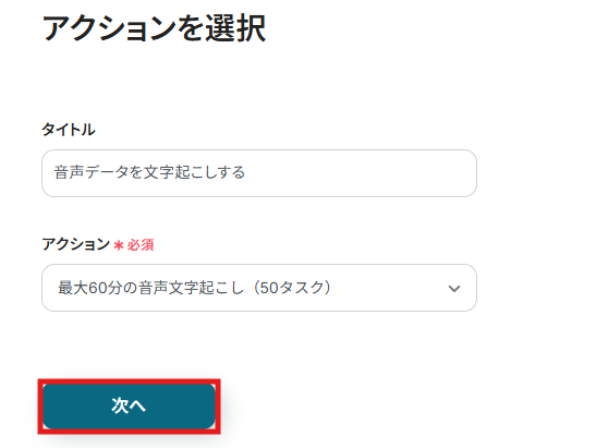 2) アクションは「最大60分の音声文字起こし(50タスク)」が選択されていることを確認し、「次へ」をクリックします。