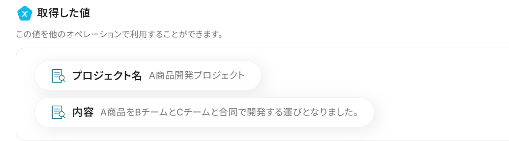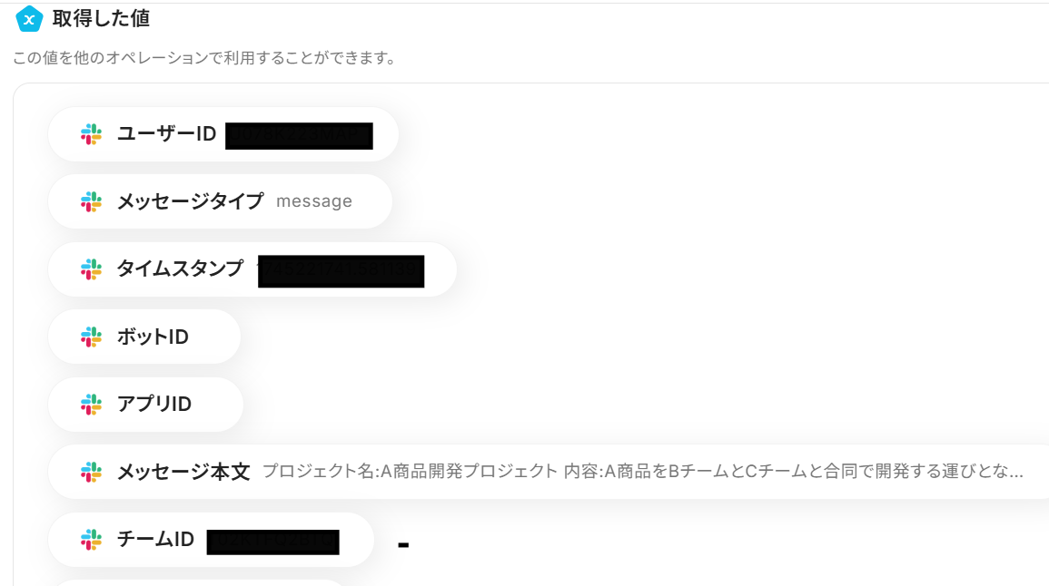 正しく連携できていると、画面下部のアウトプットにメッセージ内容が表示されます。 このアウトプットをこのあとのアクション設定時に利用します。
