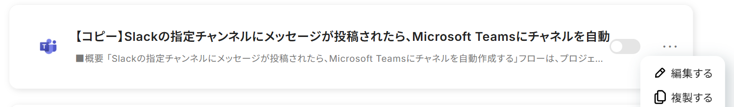 以下の画像が表示されたら、トリガーをONにしてください。 これですべての設定が完了したので、Slackの指定チャンネルにメッセージが投稿されたら、Microsoft Teamsにチャネルを自動作成されるかを確認してみましょう。