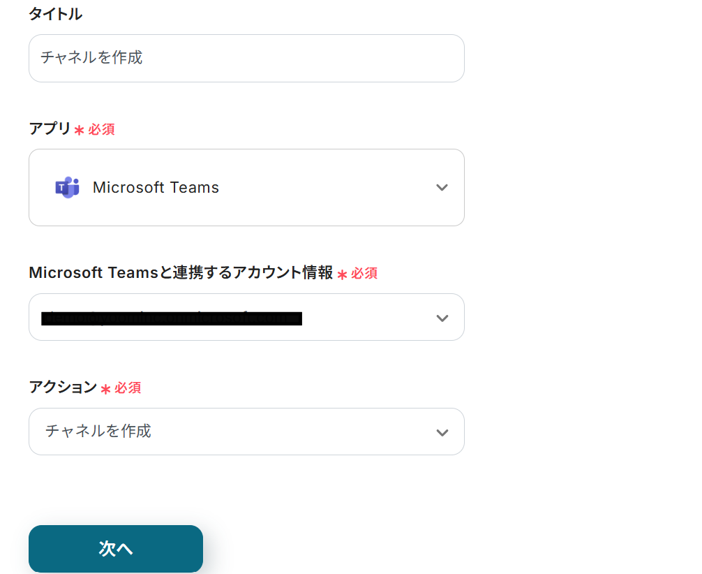 こちらもタイトルと連携するアカウント情報を任意で設定し、アクションはテンプレート通りのまま「次へ」をクリックして進んでください。