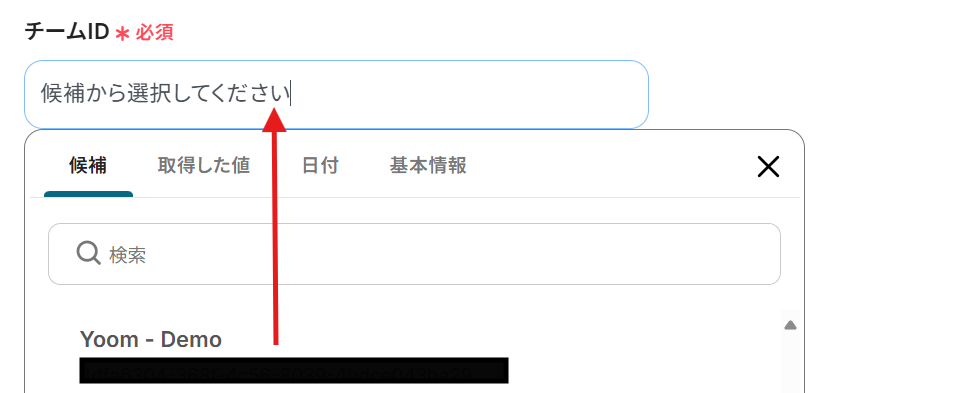 チャンネルID :該当欄をクリックするとメニューが表示されます。赤枠の候補をクリックし、表示されたものからチャンネルを選択してください。