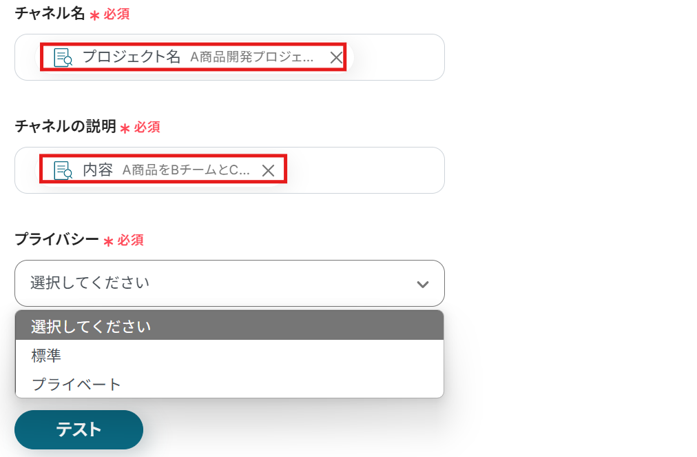 こちらもテストし、成功したら保存しましょう。 ※テストを行うと、Microsoft Teamsにチャネルが作成されるのでご注意ください。