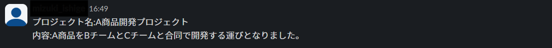 ここで先ほど指定したチャンネルに、以下のようなテスト投稿をします。