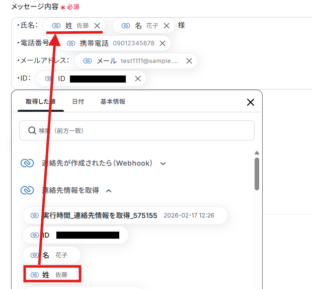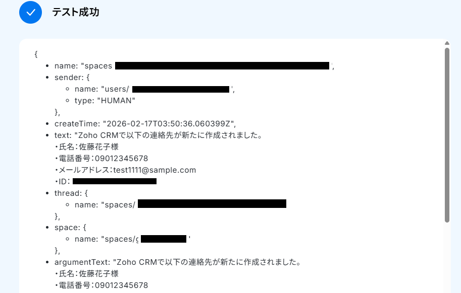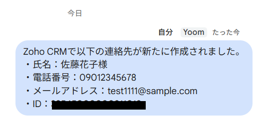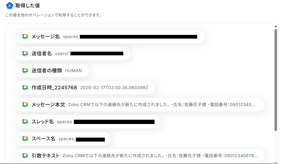 デフォルトの設定のまま使用すると、Zoho CRMに作成した連絡先の「姓」「名」「携帯電話」「メール」「ID」を引用し、自動でGoogle Chatにメッセージ送信できます。