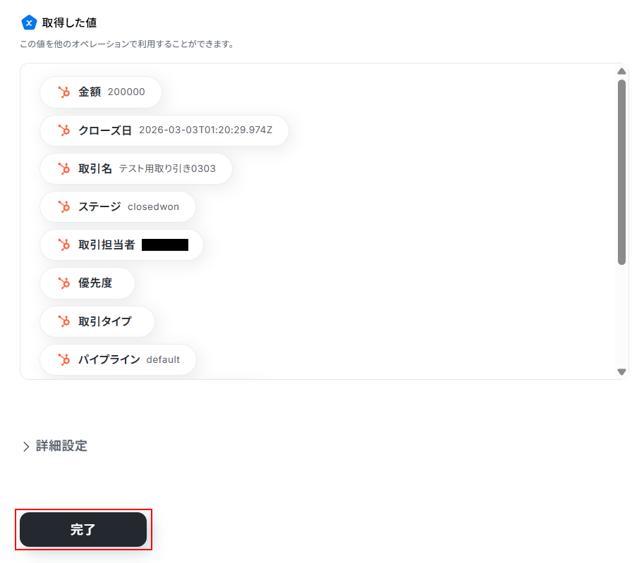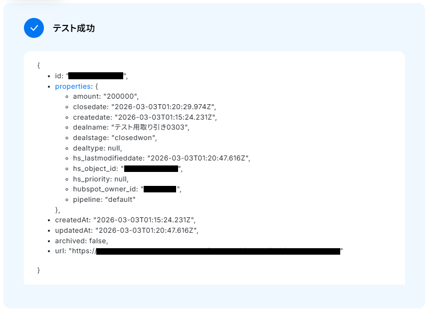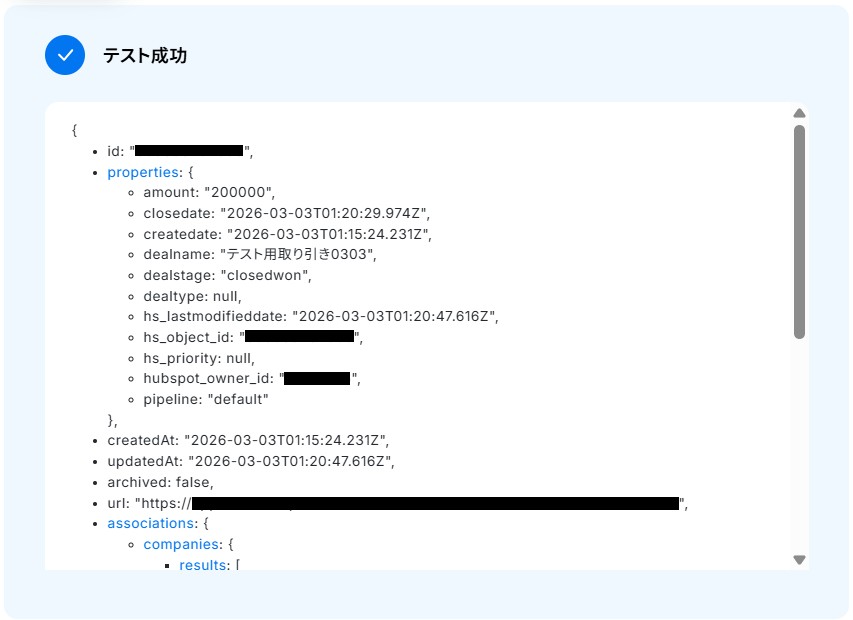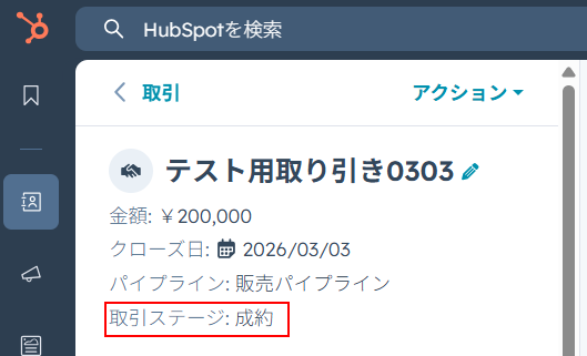 ここまで設定できたら、HubSpotの画面に移動し、テスト用の取引を作成・更新しましょう。