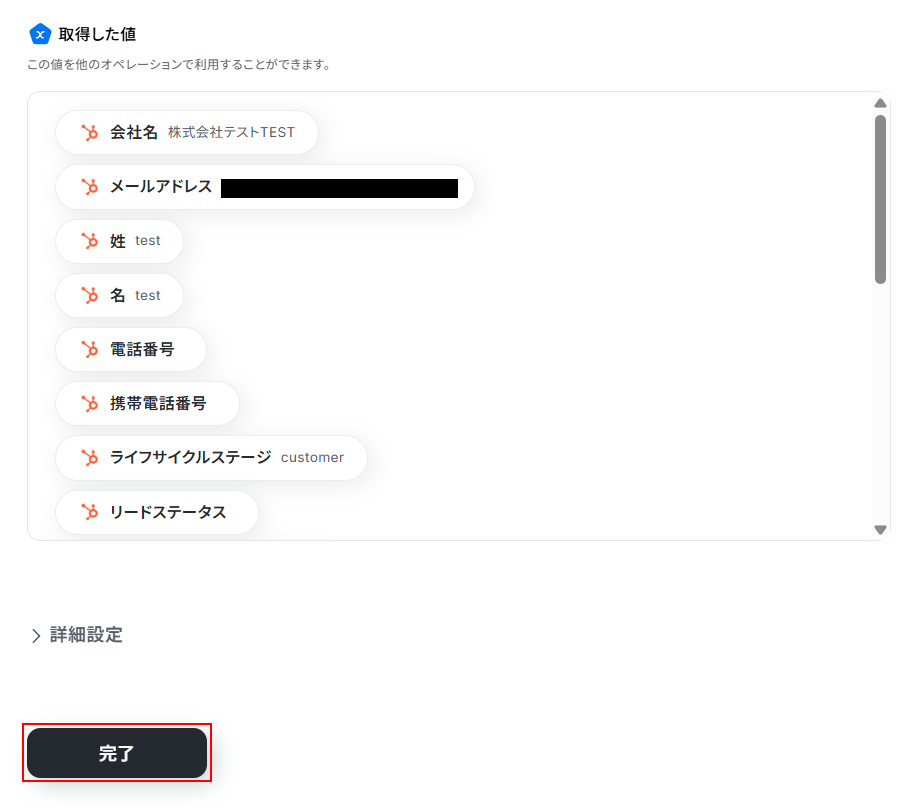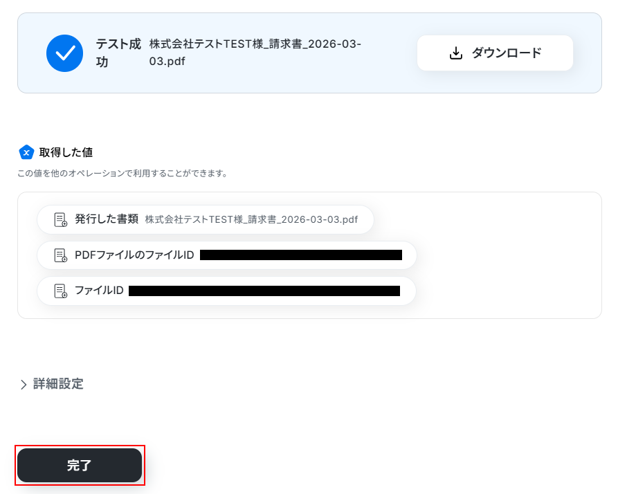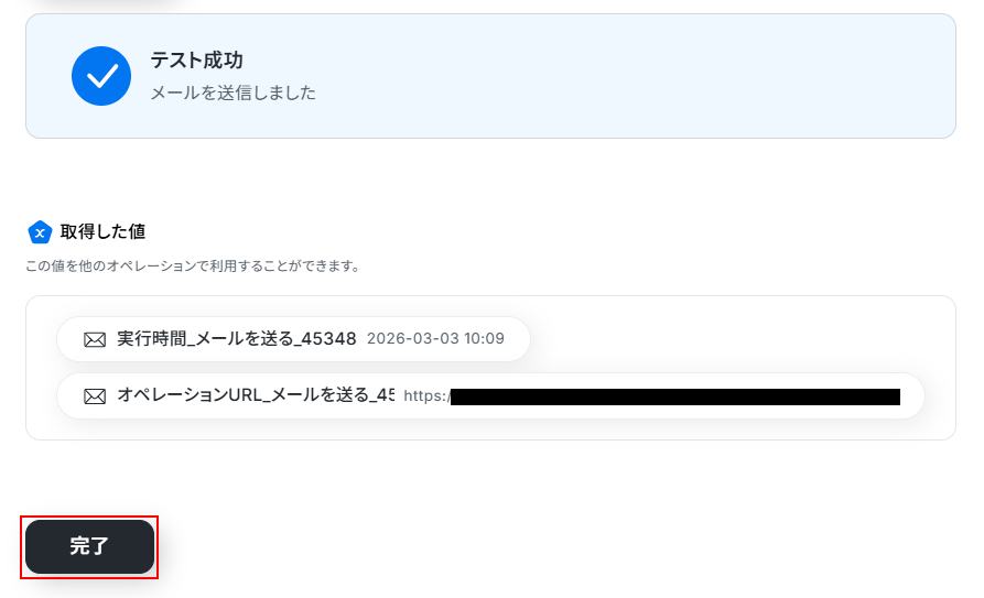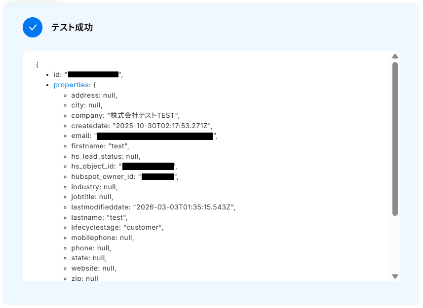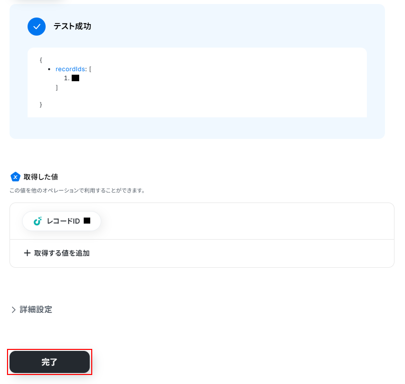 テストに成功するとテスト成功画面と取得した値が表示されますのでご確認ください。