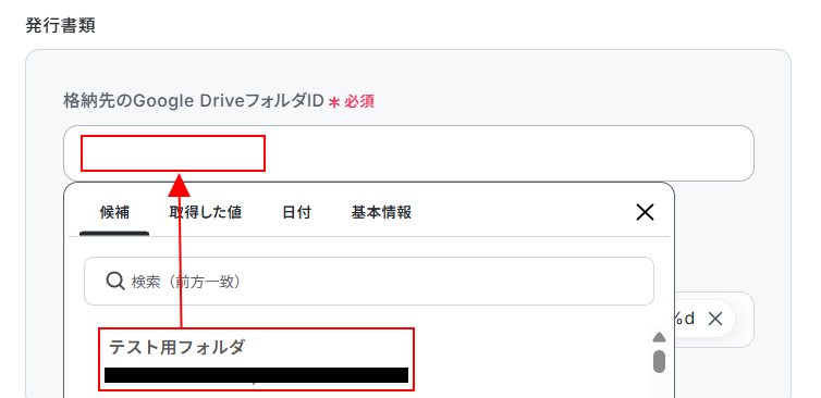 格納先のGoogle DriveフォルダIDも同様に入力欄をクリックし、表示された候補の中から使用したいものを選択します。