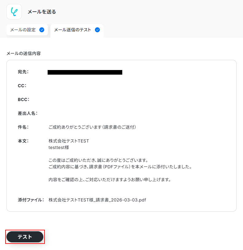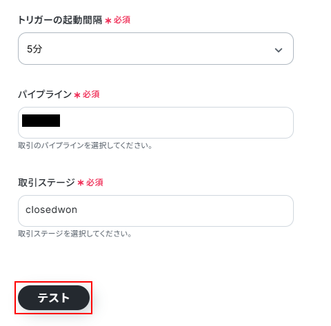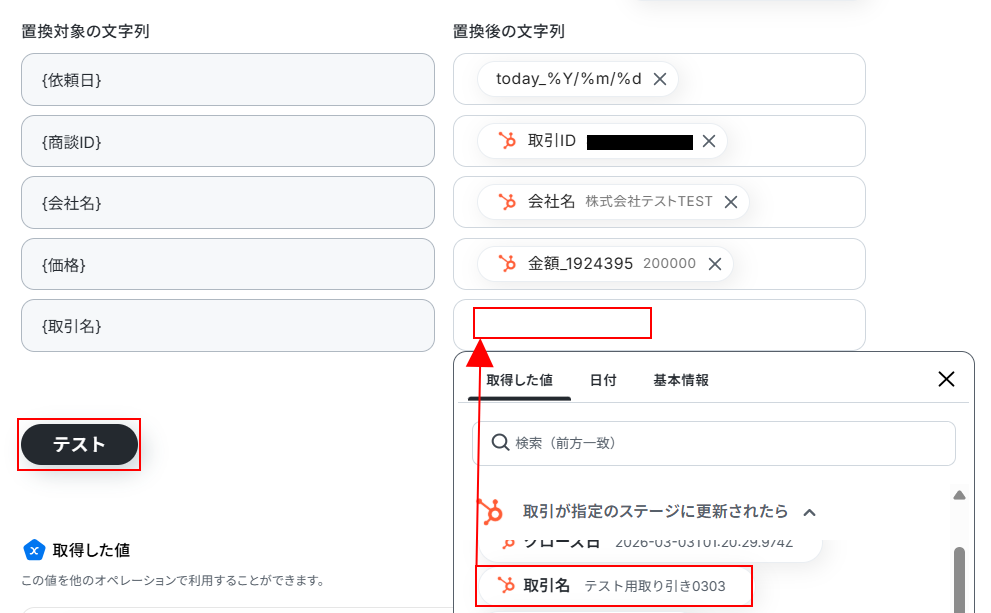 取引のステージを更新したらYoomの画面に戻り、テストをクリックします。
