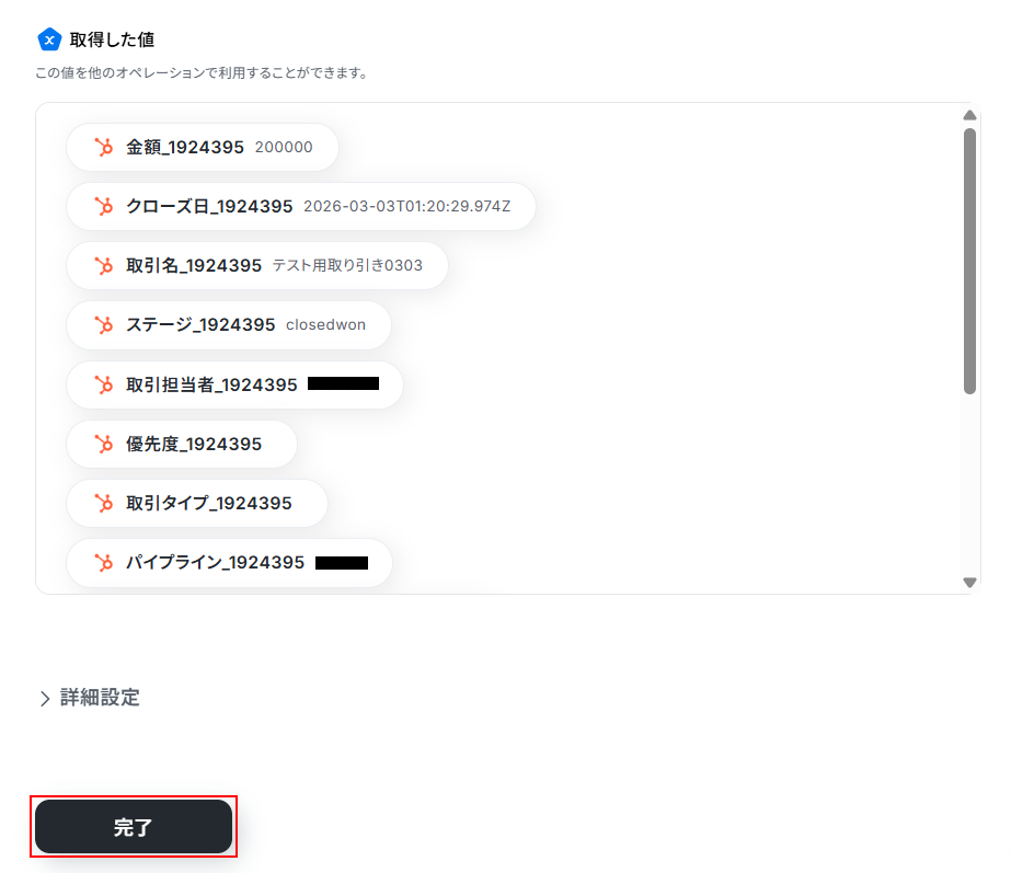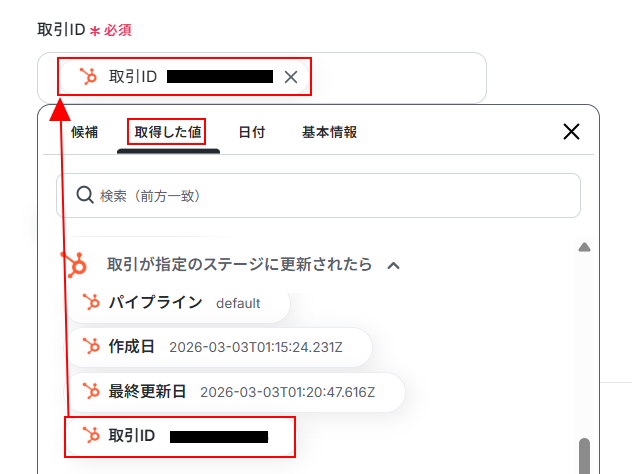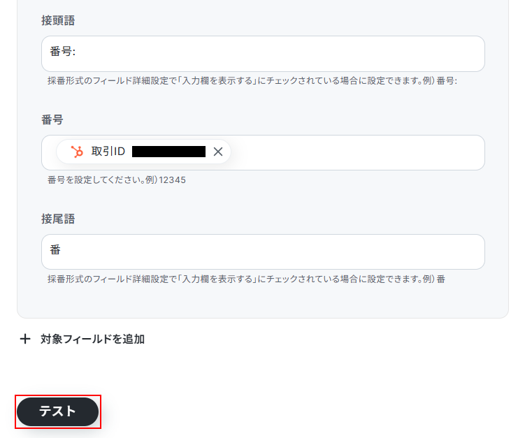 次に、番号には取引IDが取得した値として設定されていますので、項目名だけではなく、実際の値が表示されていることを確認しましょう。