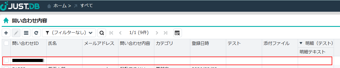 JUST.DBの問い合わせIDに値が挿入されていますのでご確認ください。