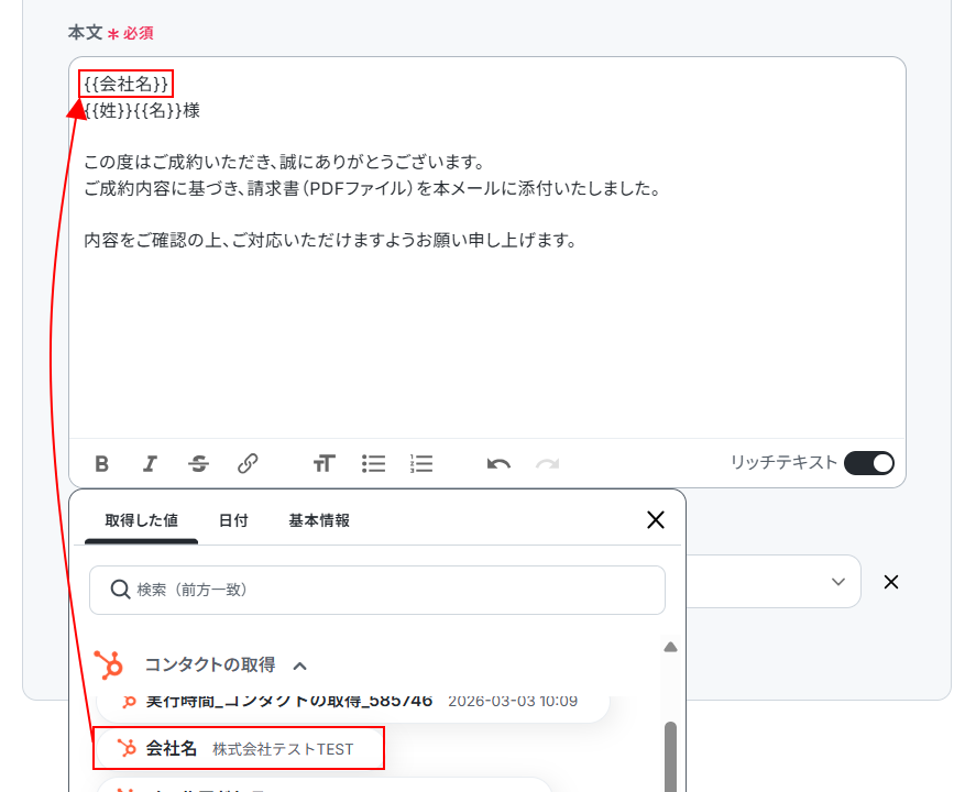 置換対象の文字列には雛形に作成した項目が表示されます。