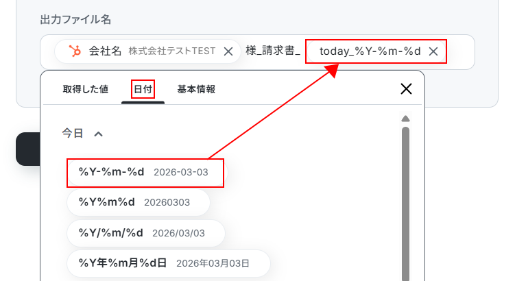 日付の情報を利用したい場合は、以下のように入力欄をクリックし日付タブを選択したら、使用したい形式のものを選択してください。
