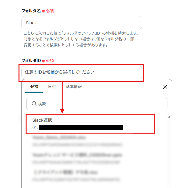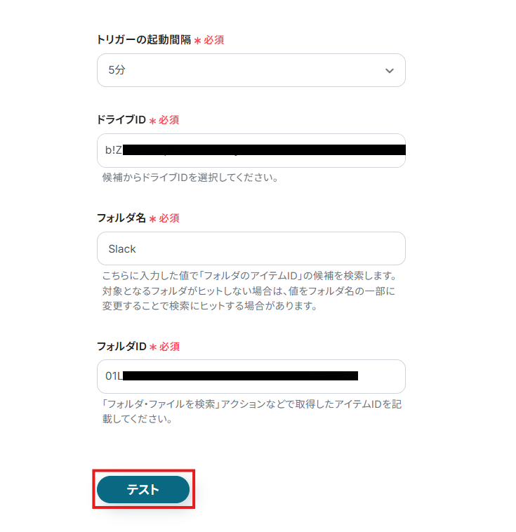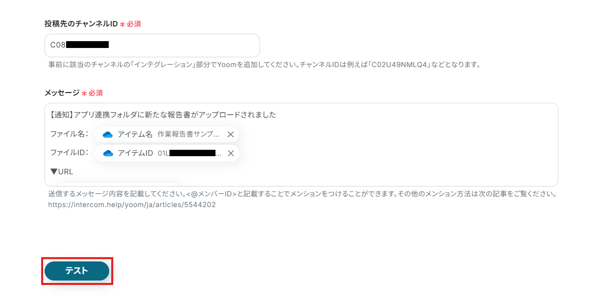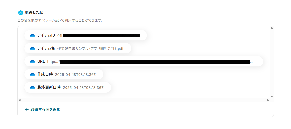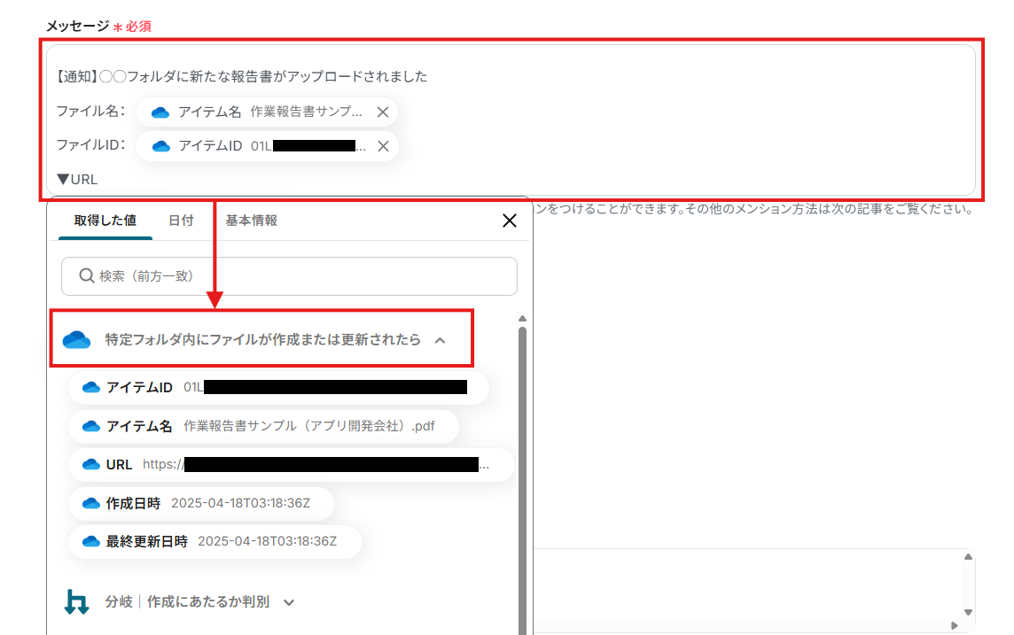 - 「ファイルのアイテムID」にはデフォルトで、ステップ3で取得した値(ファイルのアイテムID)が設定されています。