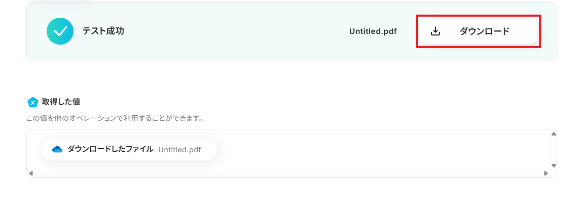 - テストが成功すると、「抽出したい項目」に設定した項目の値が添付ファイルから抽出され、「取得した値」に追加されます。
