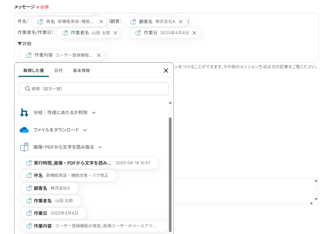 入力欄クリック時に表示される「取得した値」タブから、各アクションで取得した値が選択可能です。