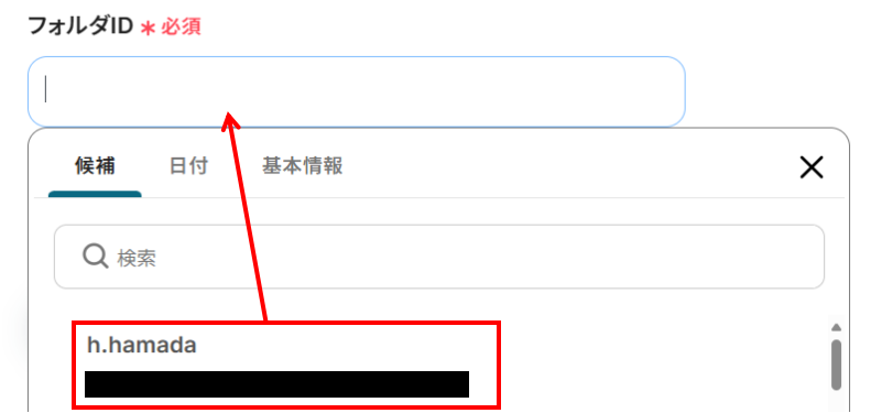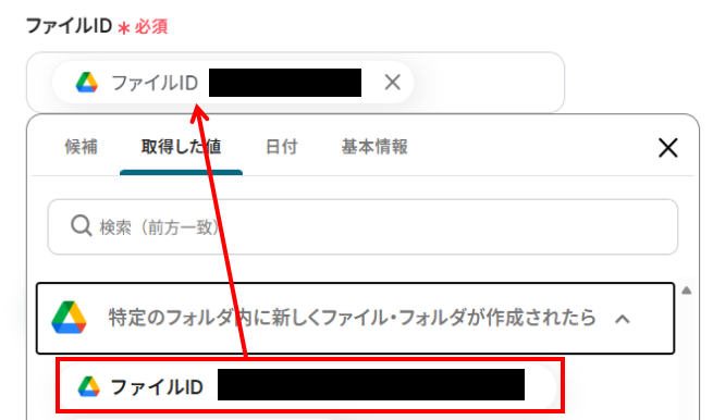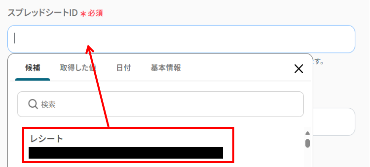 - スプレッドシートID:入力欄をクリックして表示される候補から、先ほど作成したGoogle スプレッドシートのファイルを選択します。