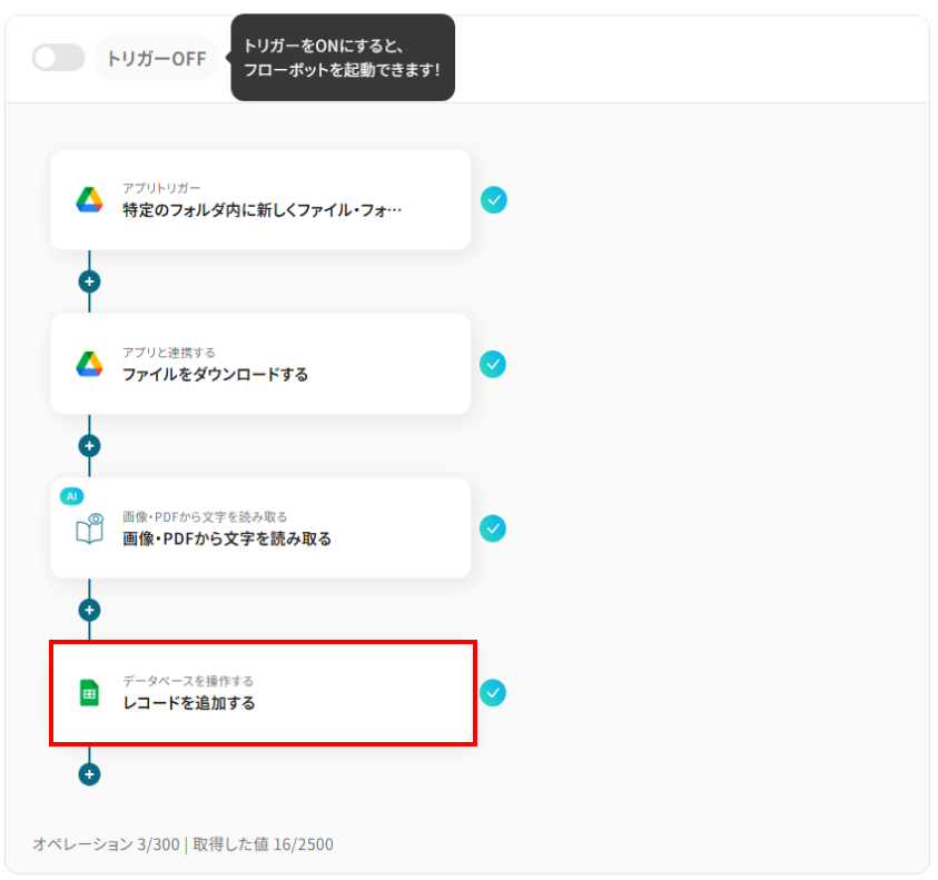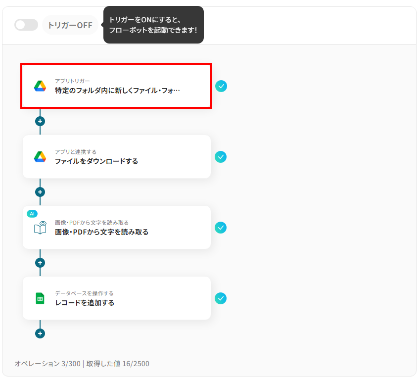 それではここから代表的な例として、「Google Driveにレシート画像がアップロードされた際に、OCRで情報を読み取り、Google スプレッドシートに自動で追加する」フローの作成方法を解説していきます!