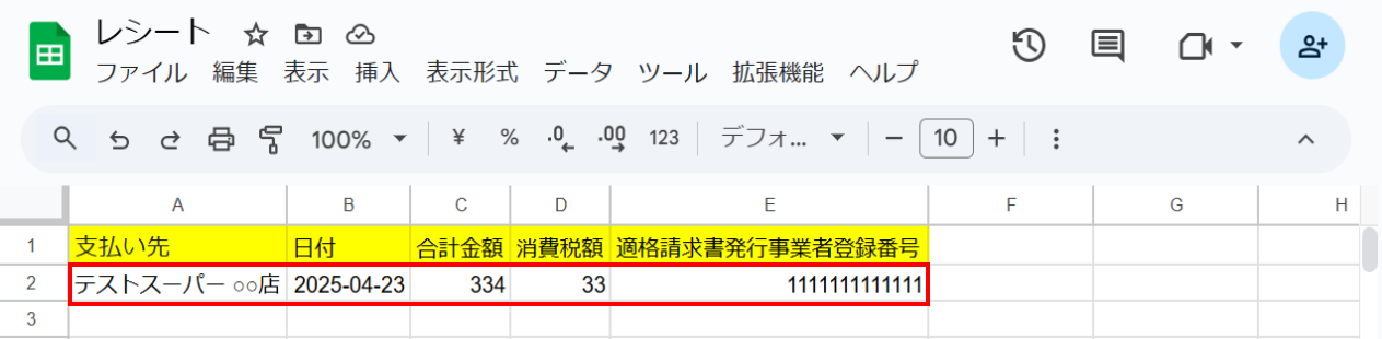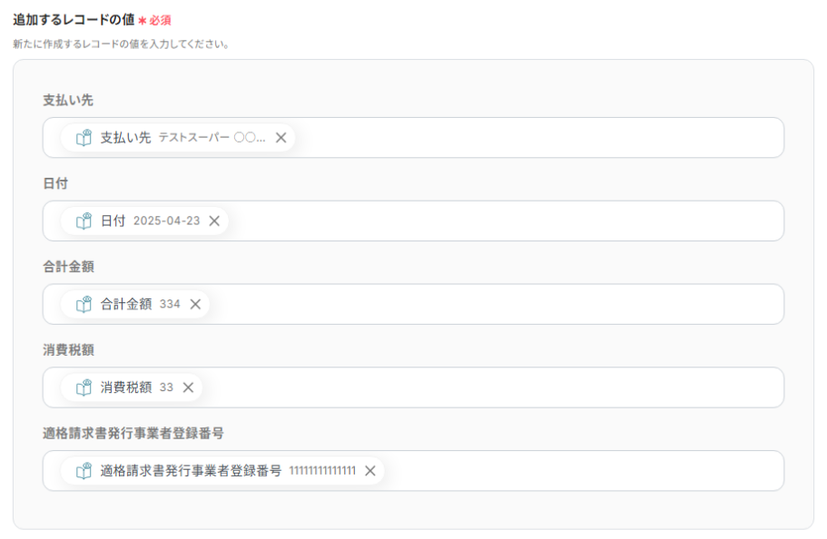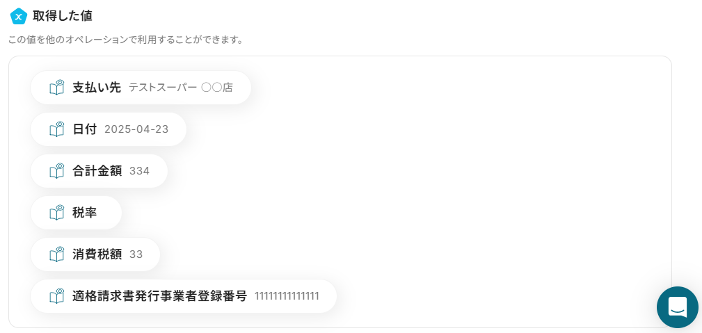 レシートの内容から、指定した項目のテキストが抽出されていればOKです!