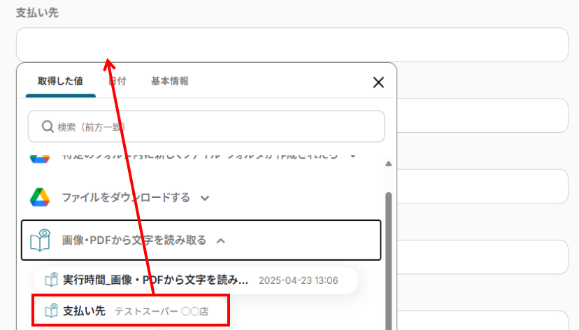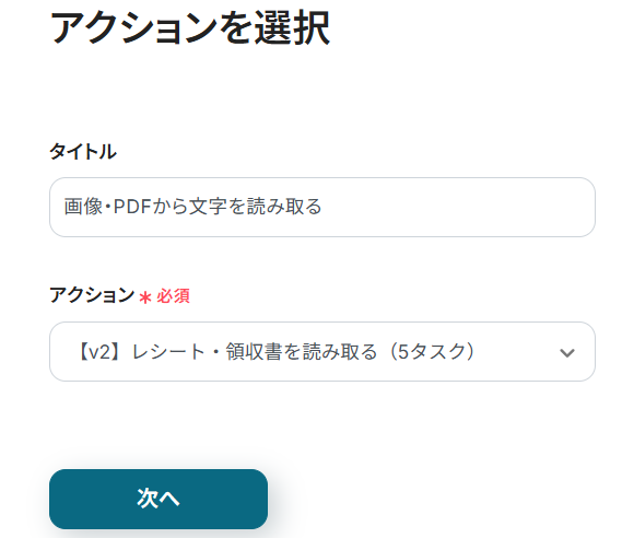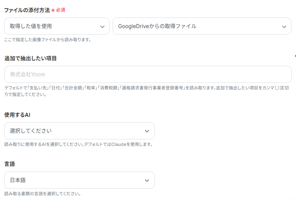 ここでは、指定したレシートのPDF・画像ファイルからAIを用いて文字情報を読み取る設定をします。