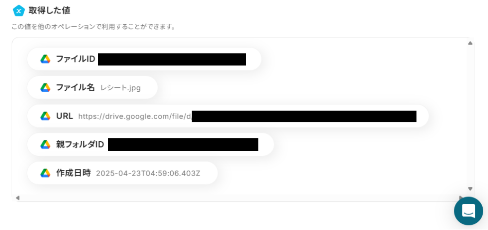 テストが成功すると、ステップ4でダウンロードしたレシート画像からテキストデータが抽出されます。抽出されたデータが下図のように、アウトプットとして取得できるので内容を確認してください。