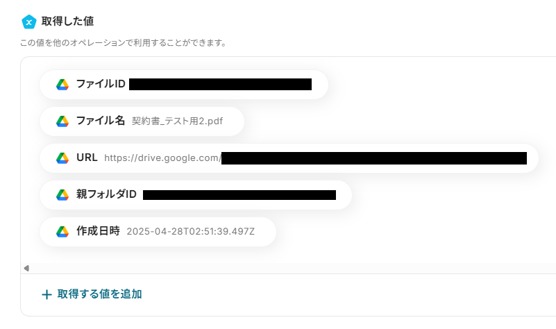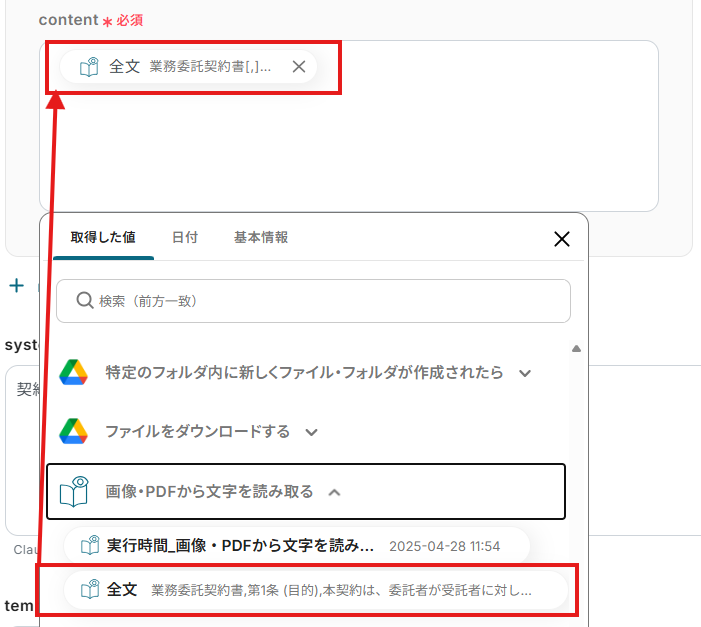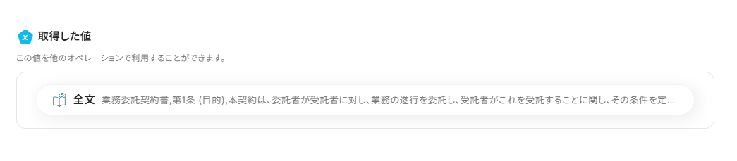 ※今回は、アウトプット(取得した値)が空白だったため「書類内容」が空白ですが、値が入っていると、「書類内容」にAnthropic(Claude)で要約された内容が表示されます。