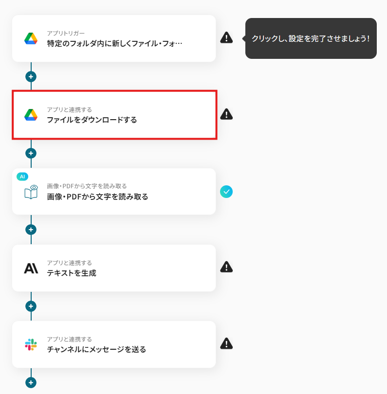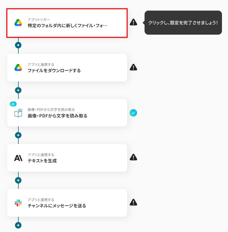 それではここから代表的な例として、Google Driveに特定のファイルがアップロードされた際に、そのファイルを自動でOCR処理し、Anthropic(Claude)で内容を要約してSlackに通知するフローを解説していきます!