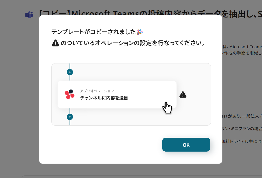 そうしますと、Yoomのワークスペースにテンプレートがコピーされ、自動化フローの設定画面(フローボット)が開きます。 「OK」をクリックして、フローの設定に進みましょう。