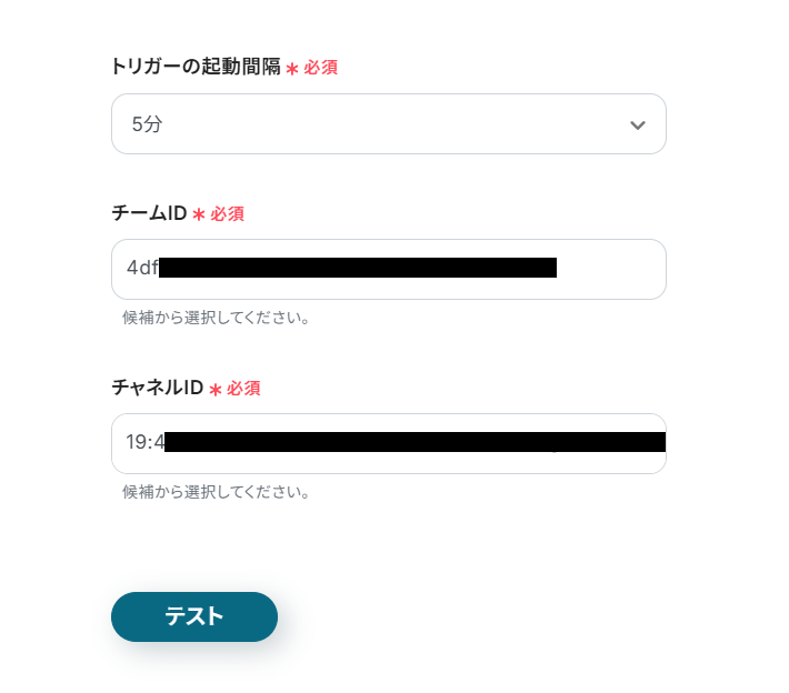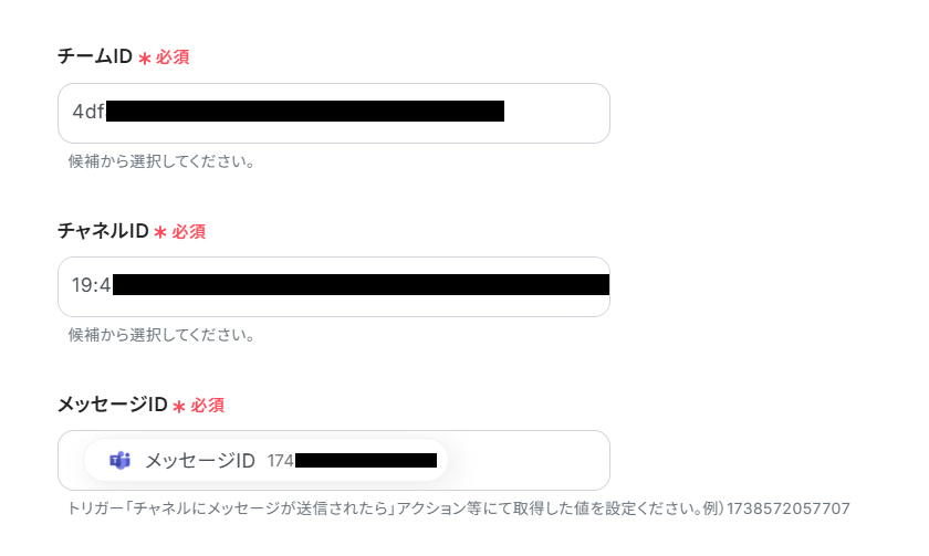 「チームID」と「チャネルID」には、ステップ3で設定したIDと同一のIDを設定。