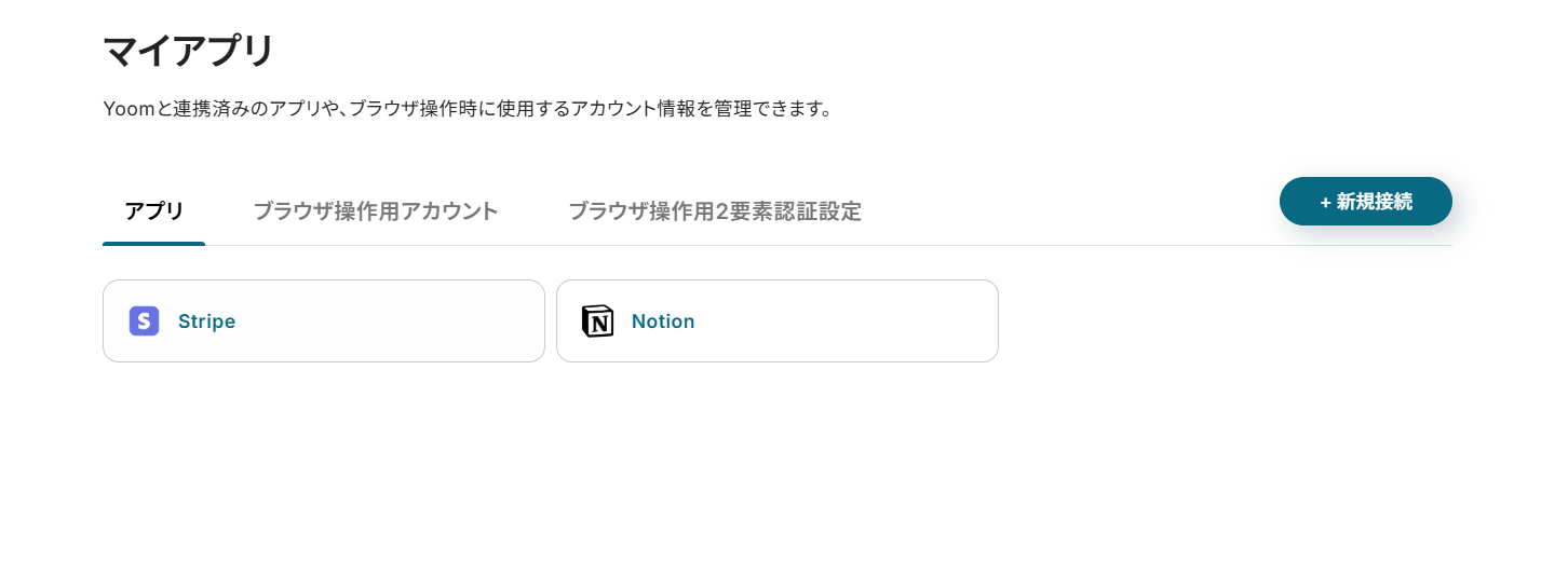 マイアプリ画面にStripeも追加されていれば、このフローで使用するアプリのマイアプリ登録は完了です。
